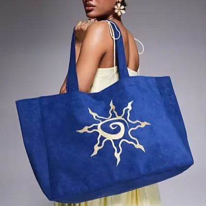 Women's Large Summer Beach Terry Cloth Tote Handbag Casual Overnight Gym Towel Two Straps Button Open Printed Design