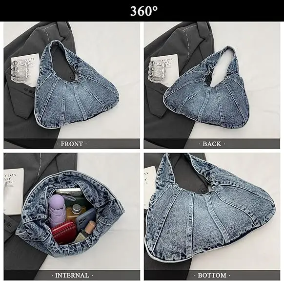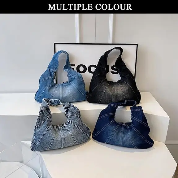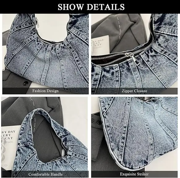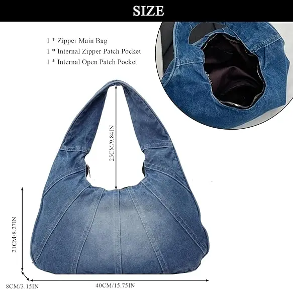 Ladies Vintage Casual Hobo Handbag Polyester Lined Crossbody Messenger Shoulder Bag with Zip Closure Fashion Style Denim Handbag
